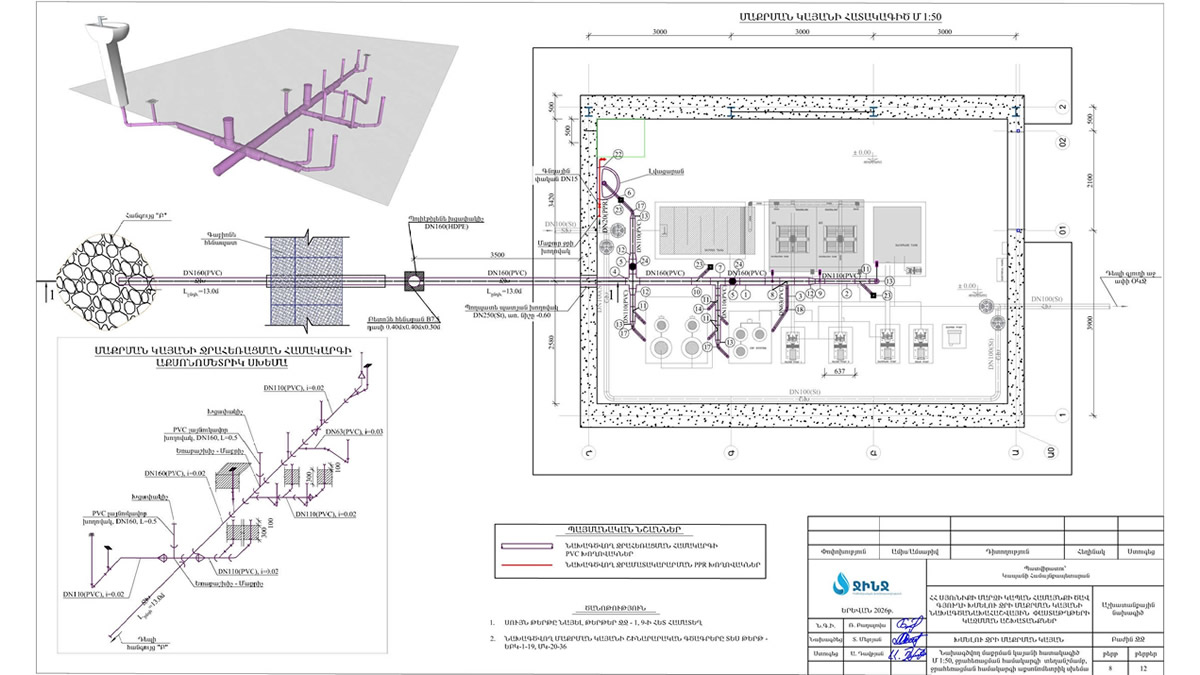 - մաքրման կայան ջրի մոտեցման և մաքրված ջրի հեռացման խողովակաշարերի և ներտարածքային այլ ենթակառուցվածքների նախագծում,